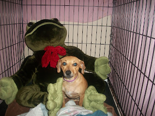 so as some of you guys know yesterday was my last ouchie appointment wiff the ouchie doctor. ash you can shee even if i's to go out for not so good tings i's to look full of the cutie patooty-ness just in case their ish some pawllywood agent round bout who ish looking for the next big woggie staw. i pawsonally fink i would be a great micaela and would take right ofur megan fox's spot in the next transformers movie. but whywoo thats another stowy. so we went to get my ouchie taken care of and i's to hope furry much hawd that i's to never get those evil worms again. i was furry much full of the frar-y shivers butt shince mommish was there and talking sweet nothings to me i's to calm down and trust her. so guess what???? ash some of woo may know I lucky, also known as lucky charm, better known as the wee lucky penny am sorta a daddish girl. he wuvs me so and tells me most everytime. well when we got home from the ouchie doctor he had a big o surrprrise for the wee one. my furry own magical mr froggy. !!!!!!!!